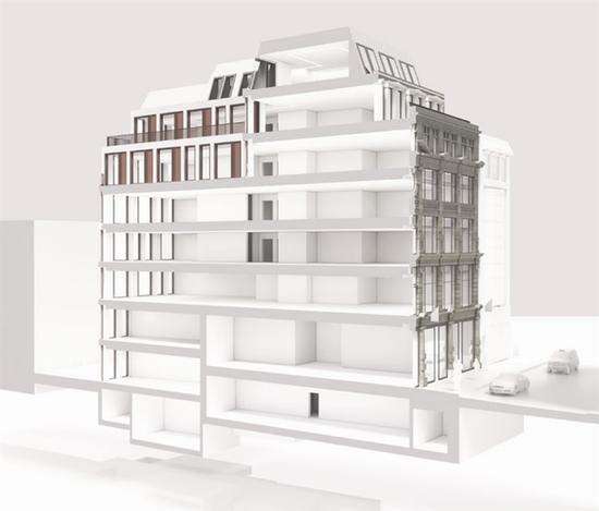 The retained façade carries its own vertical load, lateral restraint brackets between the retained façade and new steel beams have been designed and coordinated with spatial and thermal requirements. These are vertically slotted to avoid vertical load transfer between the retained and new structures and account for the variations between the original and new floor levels.